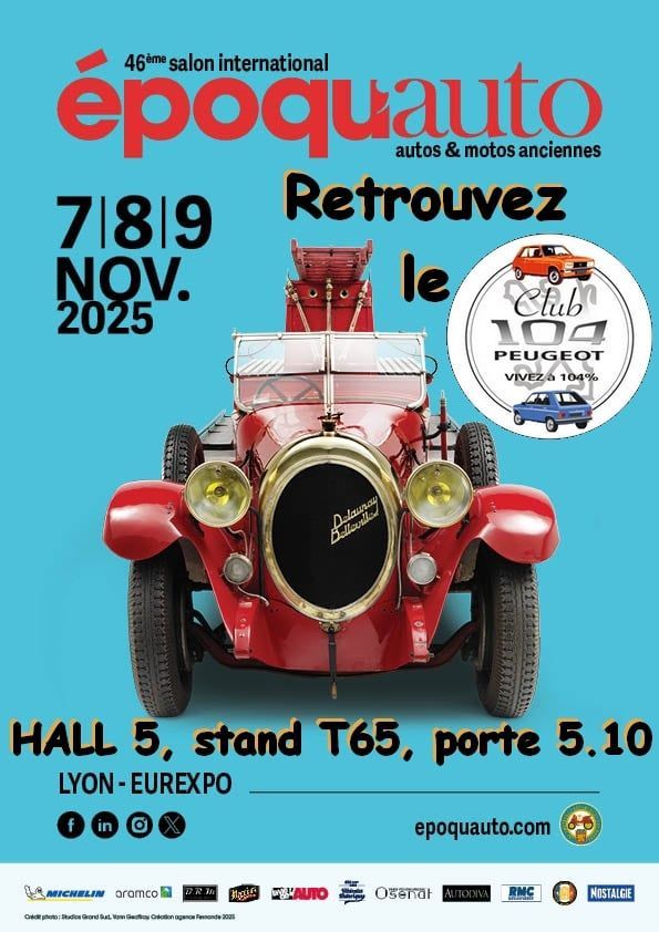 Les 5 et 6 Avril 2025 a eu lieu le salon Auto Rétro au parc des expositions de Périgueux. Le club 104 Peugeot était représenté avec une organisation au petit soins par Francis et Patricia. 3 voitures étaient exposées: Une 104 ZS2 de Francis Une 104 ZS 80 hp d'Eric Une 104 GR de Christophe Avec l'aide d'Eric, Christophe et Patricia, le stade du club a fait son impression avec toujours les visiteurs pleins de souvenirs de jeunesse.